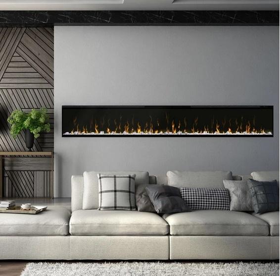 Ignite XL 100 ″ is a panoramic wall fireplace with the Optiflame LED flame effect and the patented Multi-Fire XD system, which creates an extremely realistic illusion of fire. The hearth is decorated with acrylic ice cubes illuminated in seven colors, creating a spectacular visual effect. The fireplace is distinguished by a modern design, and its installation is facilitated by a housing with a depth of only 15 cm. Ignite XL 100 ″ is the longest model in the offer of wall-mounted fireplaces, which is the focal point of any interior arrangement, both in private and public spaces. This model has a 1.8 kW fan heater, thermostat, timer and a multifunctional remote control. The heating system with the patented Comfort $ aver system consumes approx. 11% less electricity compared to conventional solutions, thanks to the automatic adjustment of the fan speed and heating power. The use of LED technology, on the other hand, significantly reduces the cost of using the flame effect, which is independent of the heating mode, the cost of the lighting effect is approx. 0.4 gr / 1 h!