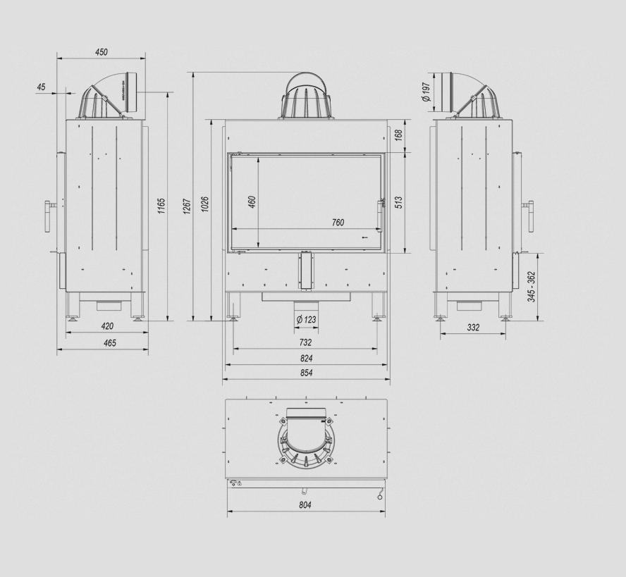 Triple combustion chamber ventilation system: primary air – provided under the grate; Secondary air is provided with holes in the back wall. In addition, a clean glass system (air curtain) is used in the cartridge.