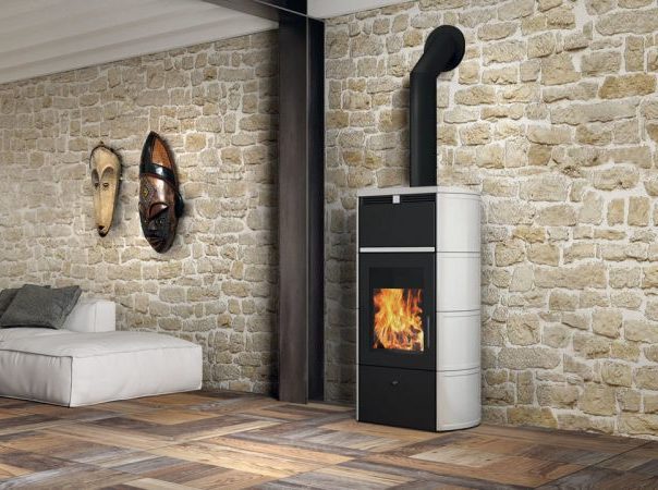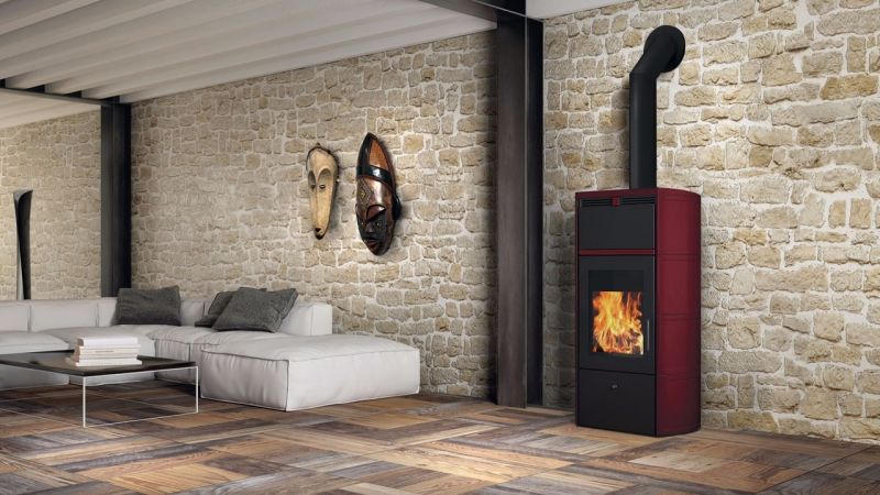 Piecyk z płaszczem wodnym drewnem. Duża szeroka szyba pionowa, podkreślająca kierunek płomieni. • obudowa z ceramiki w kolorze jasny beż, bordo, kremowym i ciemno szarym • palenisko z szamotu i stali • ujście spalin do góry • wielkość polan: do 50 cm w ułożeniu pionowym i do 33 cm w ułożeniu poziomym