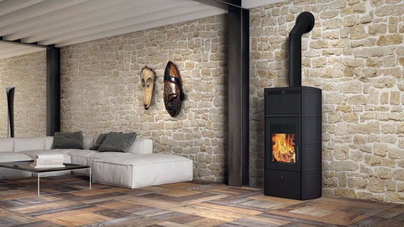 Piecyk z płaszczem wodnym drewnem. Duża szeroka szyba pionowa, podkreślająca kierunek płomieni.