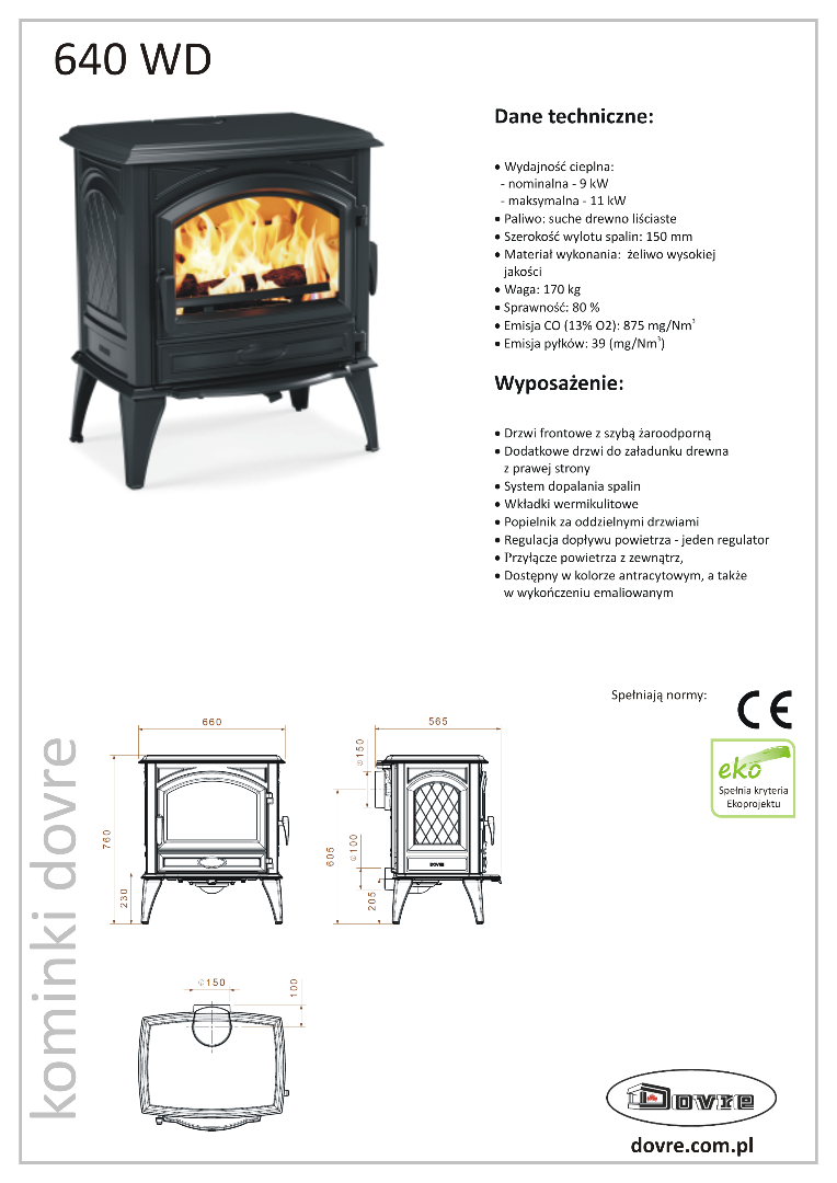 Der Kaminofen Dovre 640 WD ist eine Kombination aus Stil und Tradition. Er besteht aus hochwertigem Gusseisen und hat zwei Türen: die Haupttür, die mit dem Aschenkasten verbunden ist, und die Seitentür zum Beladen. Das traditionelle, aber schlichte Design des Ofens fügt sich perfekt in die klassischen Einrichtungen ein, und moderne Technologien wie das Abgasnachverbrennungssystem sorgen dafür, dass das Gerät sowohl umwelt- als auch haushaltsfreundlich ist.