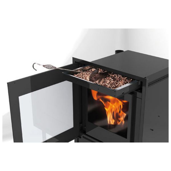 Wkład kominkowy na pelet o kompaktowych rozmiarach, przystosowany do ogrzewania wody do układu centralnego ogrzewania (do kaloryferów, mat grzewczych, paneli podłogowych i innych systemów), z dodatkową możliwością dystrybucji gorącego powietrza do jednego pomieszczenia przyległego.