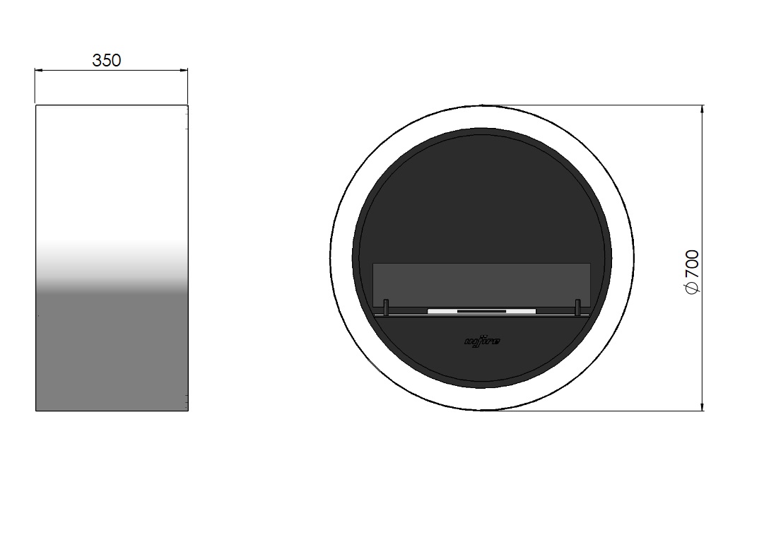 Parameters Dimensions: R 700 x 350 mm Fireplace: 500 mm = 1 l Burning time: 3-5 hours Color: Black, White, Mint Mounting: Hanging Warranty: 24 months