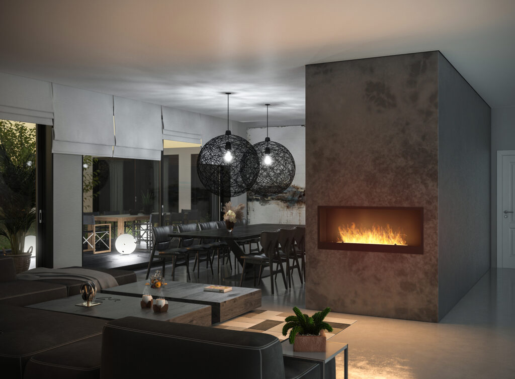 Model INSIDE 1200 to kominek przeznaczony do zamontowania w przygotowanej w ścianie wnęce. Inside 1200 to perfekcyjnie dopracowana forma z efektywnym oddawaniem ciepła do pomieszczenia. Kominek wyposażony jest we własny system odpowietrzający, który zapobiega powstaniu ciśnienia pod palnikiem przy ewentualnym przelaniu paliwa. Długi 80 cm palnik z jedną linią ognia i włóknem ceramicznym zapewnia bezpieczeństwo użytkowania jednocześnie zapewnając piękny i efektowny wizualnie ogień. Dodatkowo kominek wyposażony jest w szybę hartowaną, która podnosi bezpieczeństwo użytkowania i stabilizuje ogień.
