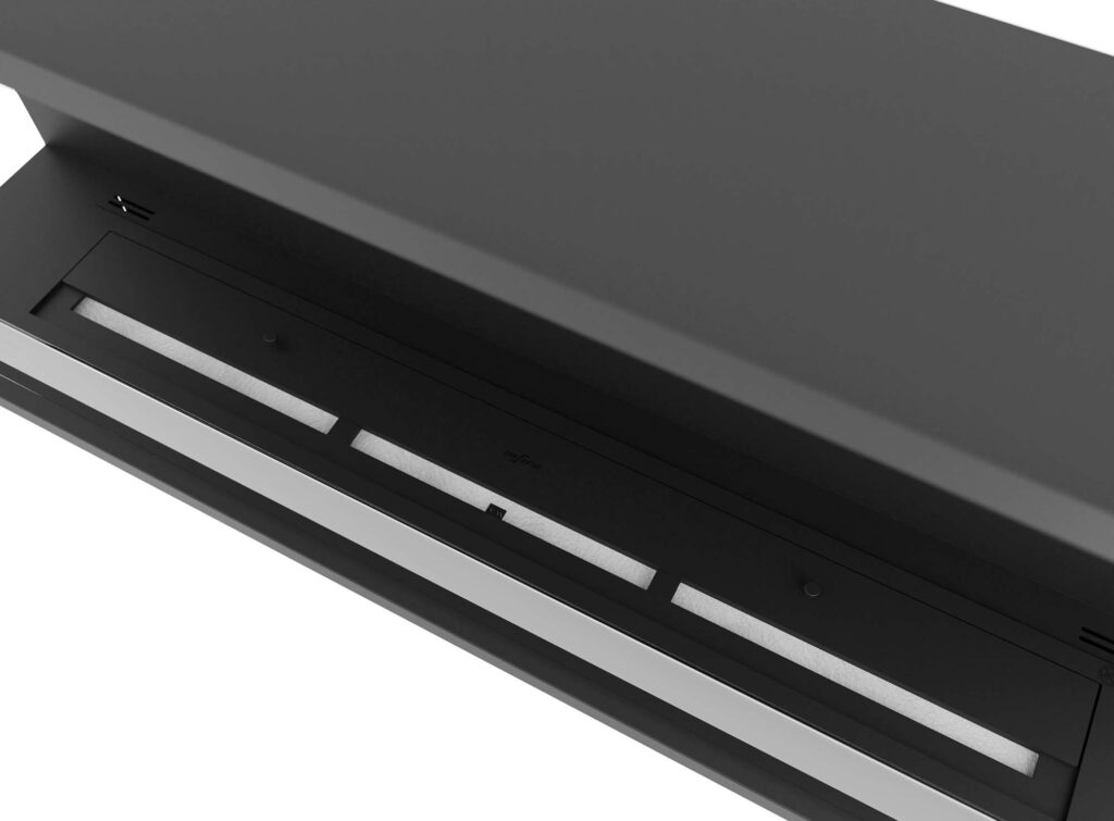 INSIDE C1200V2 to kominek przygotowany do zamontowania w przygotowanej wnęce. Jego konstrukcja ułatwia montaż w ścianie, gdyż dzięki zagiętym zakładką możliwe jest zakrycie niedoskonałości wyciętego w ścianie otworu. Dodatkowo tak przygotowana forma tworzy ramę dla ognia, który można oglądać z trzech stron. Prosta i delikatna konstrukcja kominka sprawdzi się w każdym wnętrzu, a dodatkowo stanowi doskonałe tło dla domowego ogniska.
