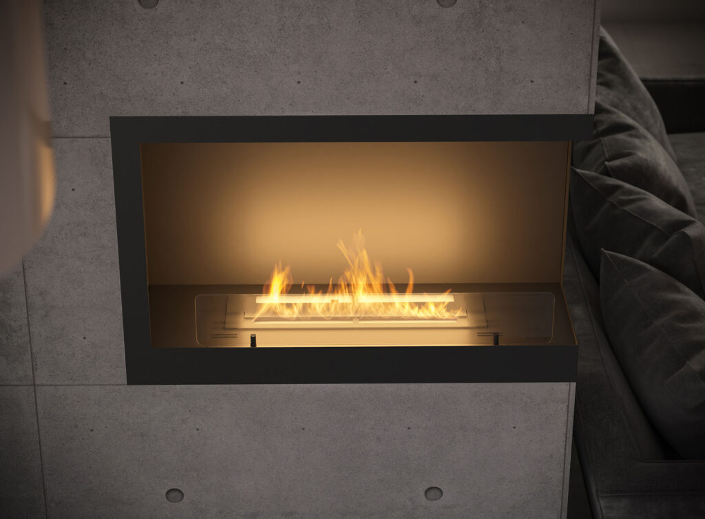 Corner model with an open right side, designed to be built into a recess. Its design ensures simple assembly and effective finish without the need for perfect processing of the edge of the hole in the wall. Fireplace equipped with a frame protruding beyond the outline of the fireplace and overlapping the wall. The slightly tinted glass stabilizes the fire and gives it a unique look.