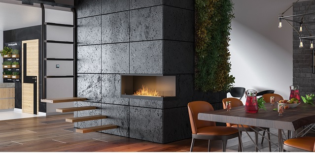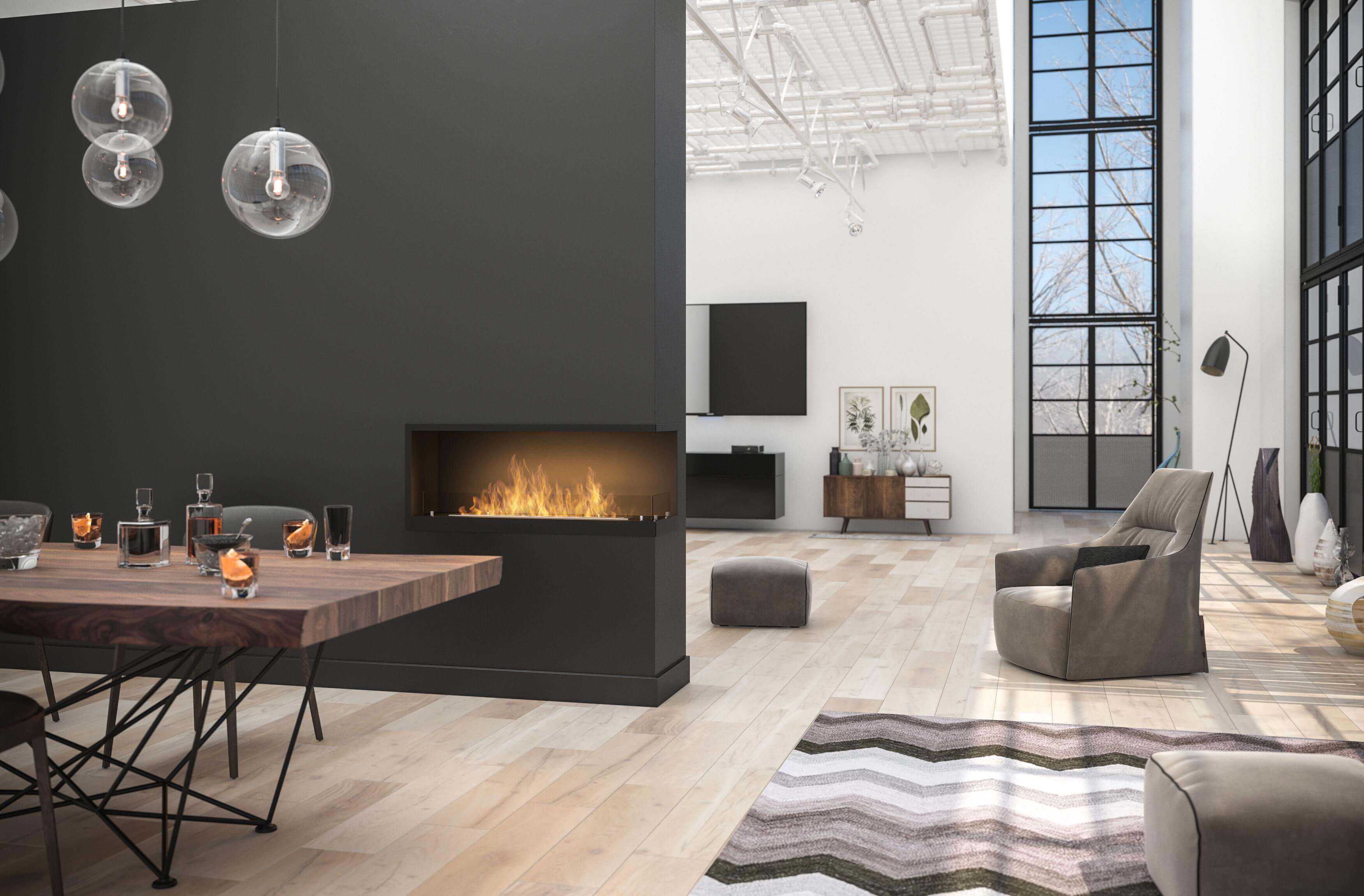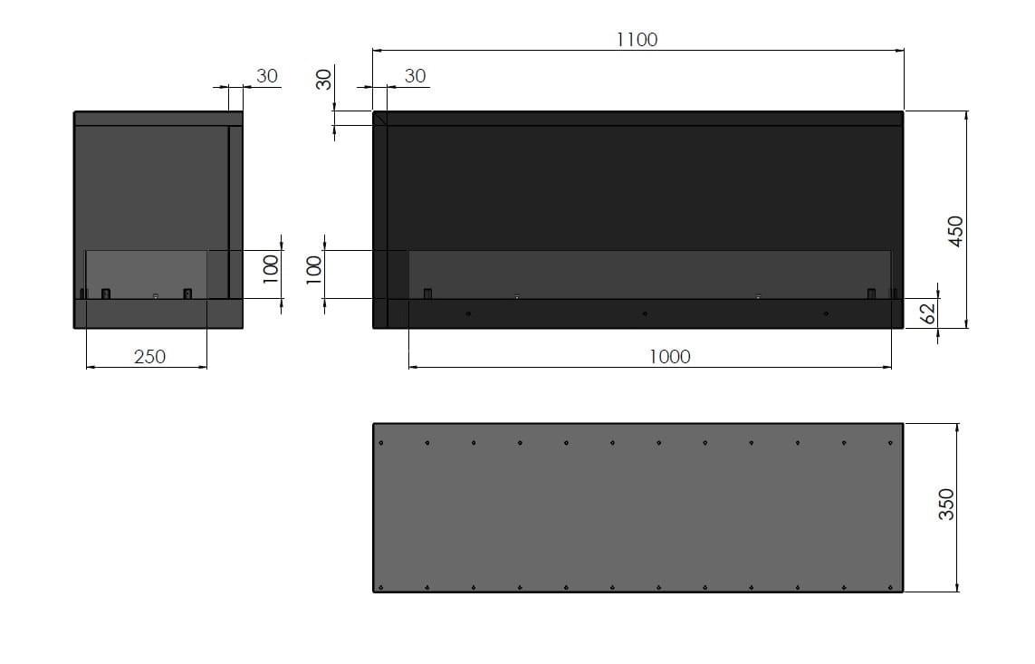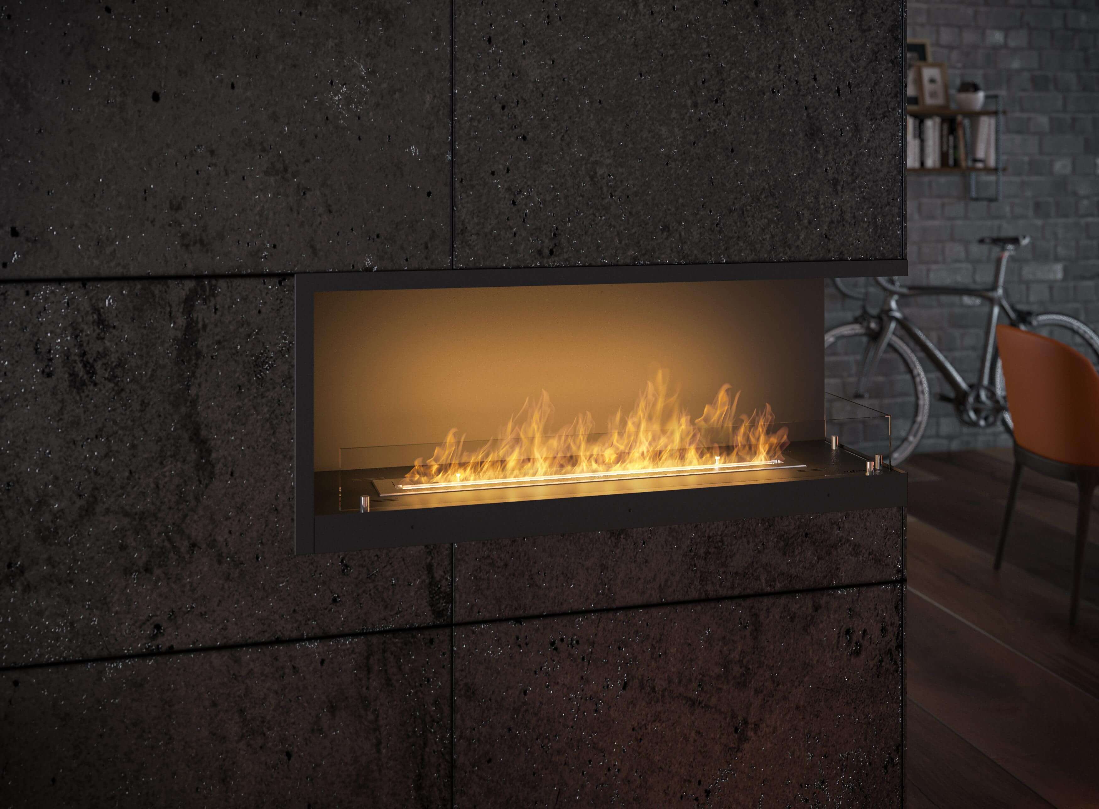 Inside L & P 1100 Vers2 fireplaces are models for easy installation in a recess. The frame of the fireplace is an extensive version containing a venting system that prevents pressure build-up under the burner in the event of fuel overflow. The fireplace also has a built-in insulation in the upper part, allowing it to be mounted, for example, in a plasterboard structure. The design also does not require making a hole in the substrate for the burner. It is enough to insert the fireplace into the prepared opening. The L version is a fireplace with an open LEFT side, and P version with an open RIGHT side. This solution allows you to observe the fire from both sides and very effective filling the passage between the rooms.
