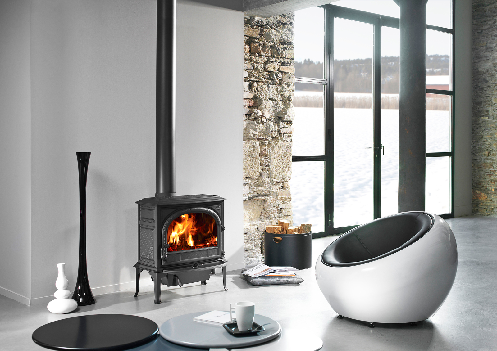 Jøtul F 400 SE ma duże szklane drzwi, które zapewniają doskonały widok na płonący ogień, ozdobiony jest wzorem który przedstawia część wybrzeża Norwegii. Piecjest dostępny w z wykończeniem emalią lub czarną farbą.