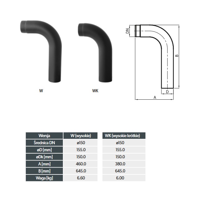 Ohnuté koleno dymovodu 90° fi 150 vysoké krátke