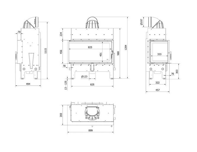 Popielnik : W formie zbiornika umieszczonego poniżej żeliwnego rusztu. Umożliwia wygodne i szybkie usuwanie popiołu z kominka.