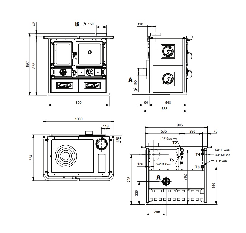 Średnica wyjścia spalin : 150 mm ( tylko z prawej strony , z tyłu lub z góry )