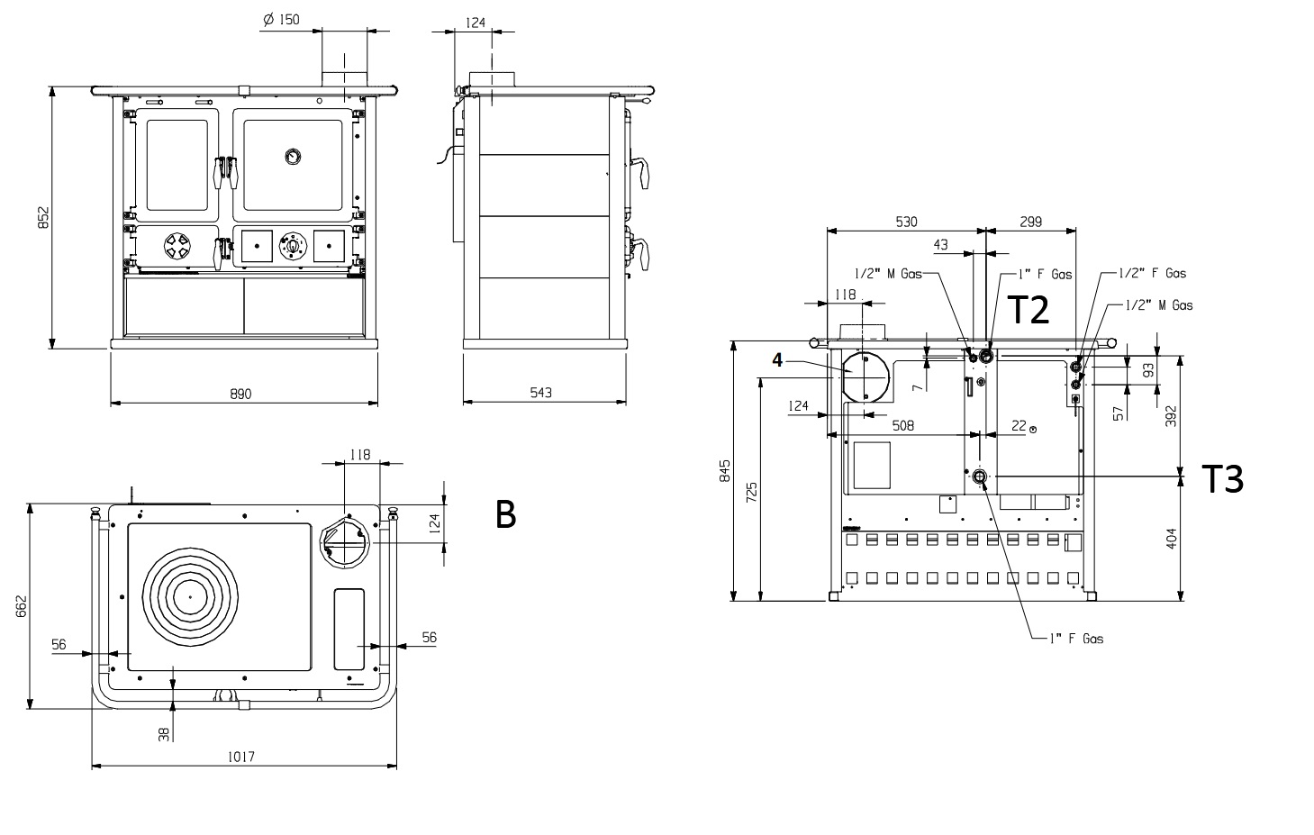 Średnica wyjścia spalin : 150 mm ( tylko z prawej strony , z tyłu lub z góry )