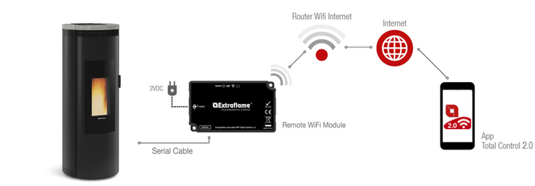 Moduł zdalnego sterowania poprzez system Wi-Fi: urządzenie korzysta z sieci internetowej pomieszczenia, w którym jest ustawione i umożliwia aplikacji na smartfonu „Total Control 2.0” połączenie się z piecem i sterowanie niektórymi jego funkcjami.