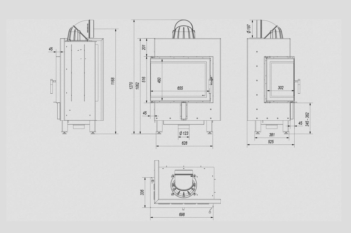 Potrójny system dopowietrzenia komory spalania: powietrze pierwotne – doprowadzone pod ruszt; powietrze wtórne dostarczane jest otworami w tylnej ścianie. Dodatkowo we wkładzie zastosowany jest system czystej szyby (kurtyna powietrza).