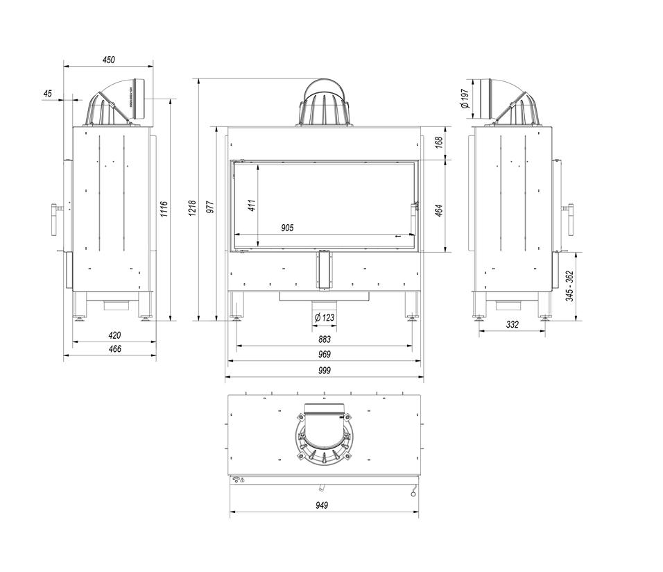 Potrójny system dopowietrzenia komory spalania: powietrze pierwotne – doprowadzone pod ruszt; powietrze wtórne dostarczane jest otworami w tylnej ścianie. Dodatkowo we wkładzie zastosowany jest system czystej szyby (kurtyna powietrza).