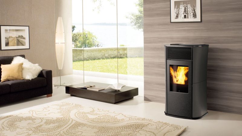 Kachle na pelety s a bokmi z tmavo šedej ocele, šedým predkom a vrchným dielom z tmavo šedého skla. 1735 euro