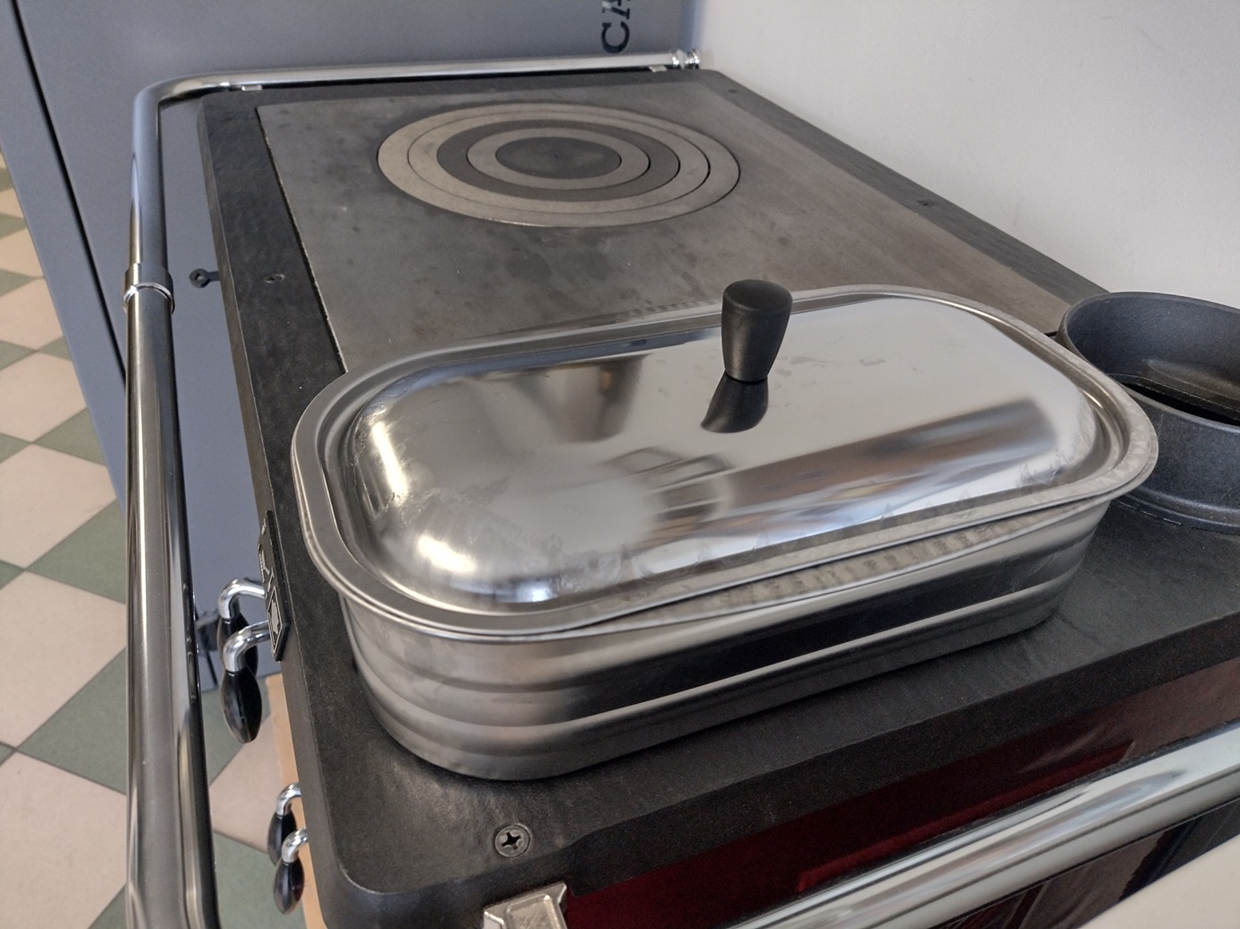 Naczynie ze stali nierdzewnej które podczas używania kuchni jest ciągle podgrzewanie.
