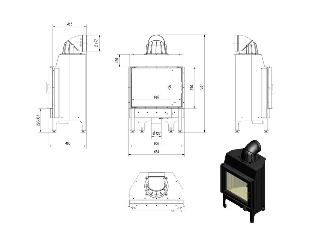 Potrójny system dopowietrzenia komory spalania: powietrze pierwotne – skierowane jest na płytę, na której odbywa się spalania; powietrze wtórne dostarczane jest otworami w tylnej ścianie. Dodatkowo we wkładzie zastosowany jest system czystej szyby (kurtyna powietrza).