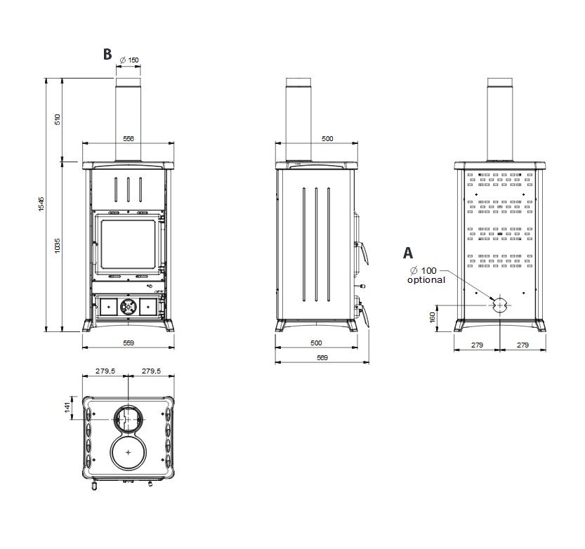 Średnica wyjścia spalin : 150 mm ( wyjście spalin z góry )
