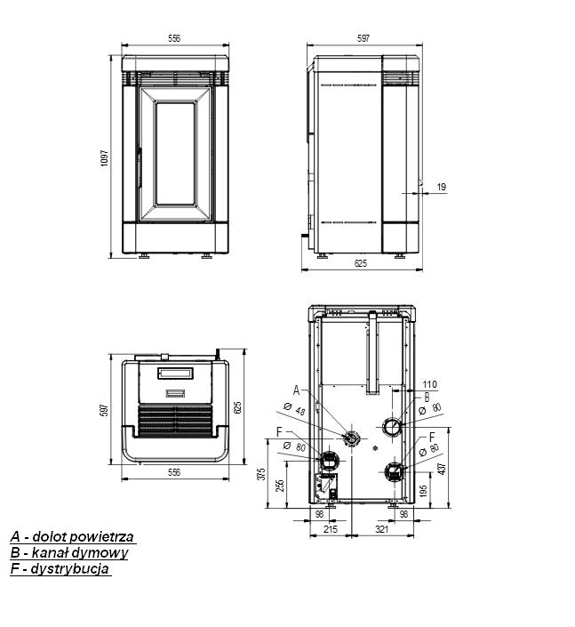 Piec wolnostojący na pellet z dystrybucją powietrza.