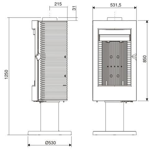 – wykończenie kolorystyczne: antracyt – spalanie wtórne – piec obrotowy (360°) – szyba panoramiczna – regulacja dopływu powietrza pierwotnego i wtórnego – przedni załadunek drewna – górny wylot spalin – deflektor – popielnik – ruszt – paliwo opałowe: drewno – 5 lat gwarancji