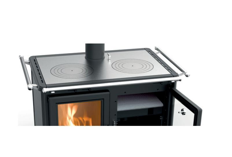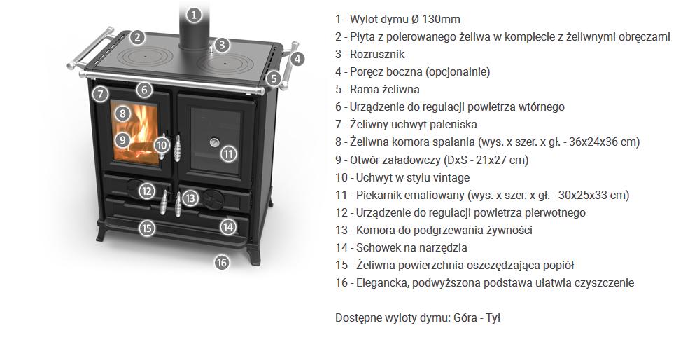 Kuchnia opalana drewnem zbudowana ze stali i żeliwa, z dużą powierzchnią wymiany i wyposażona w specjalny wymiennik ze stali nierdzewnej, żeliwną komorę spalania, regulatory do regulacji powietrza pierwotnego, wtórnego i trzeciorzędowego, uchwyty w stylu vintage o wyglądzie stali, otrząsacz rusztu , Starter ułatwiający rozpalenie w piecyku, drzwi paleniska z żeliwa emaliowanego ze szkłem ceramicznym odpornym na temperaturę 750°, rama górna z żeliwa emaliowanego, płyty kuchenne z żeliwa szlifowanego, podwójny zestaw żeliwnych pierścieni, reling przedni, drzwiczki piekarnika z termometrem, piekarnik emaliowany panoramiczny 27 l, szuflada na drewno i narzędzia, wyjmowana szuflada na popiół, nóżki z żeliwa emaliowanego. Okładzina zewnętrzna ze stali malowanej i żeliwa.