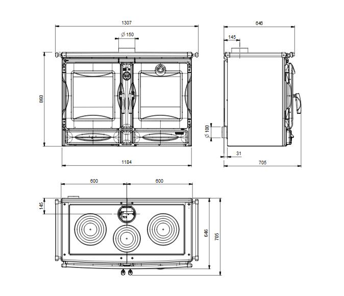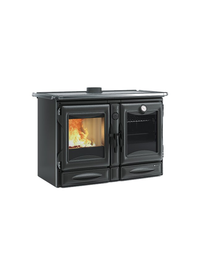 Charakterystyka: • Regulowane powietrze pierwotne i wtórne, trzecie nastawione fabrycznie • Obszerna płyta (~100 cm) do jednoczesnego gotowania kilku potraw • Żeliwny ruszt paleniskowy z regulacją wysokości • Obszerny emaliowany piekarnik (78 l) z zaworem zapobiegającym zaparowaniu i wyjmowanymi szynami • Komora spalania z Nordiker, którą można łatwo skontrolować i wymienić • Wyjmowana szuflada na drewno (lub przedmioty) • Wyjmowany popielnik