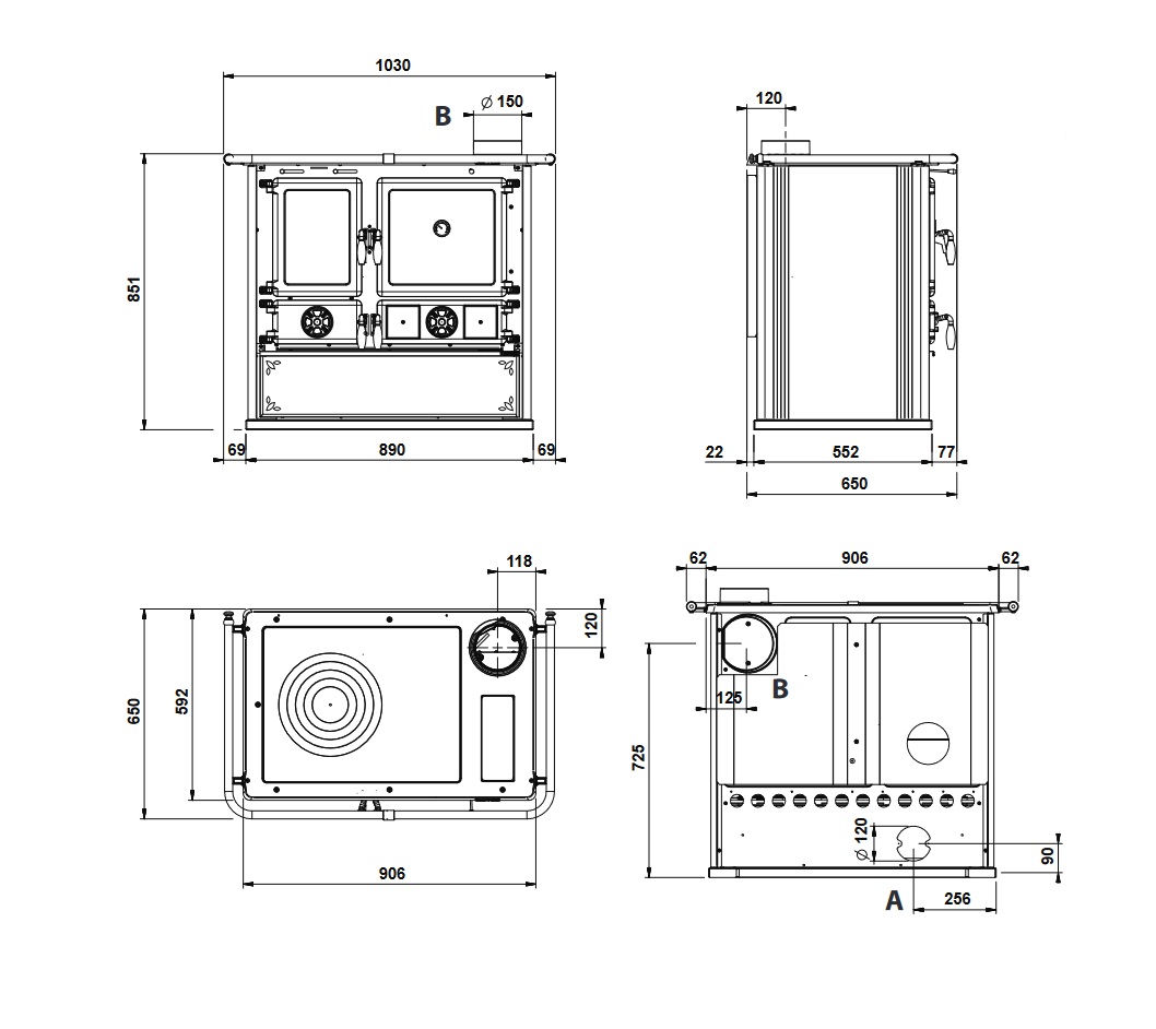 Średnica wyjścia spalin : 150 mm ( wyjście spalin z góry lub z tyłu tylko z prawej strony )