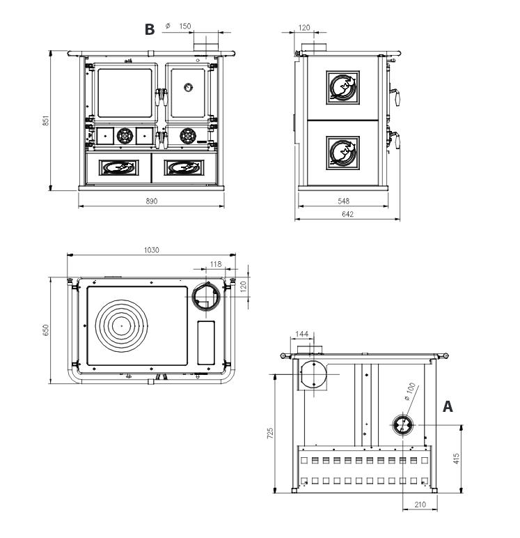 Średnica wyjścia spalin : 150 mm ( wyjście spalin z góry lub z tyłu tylko z prawej strony )