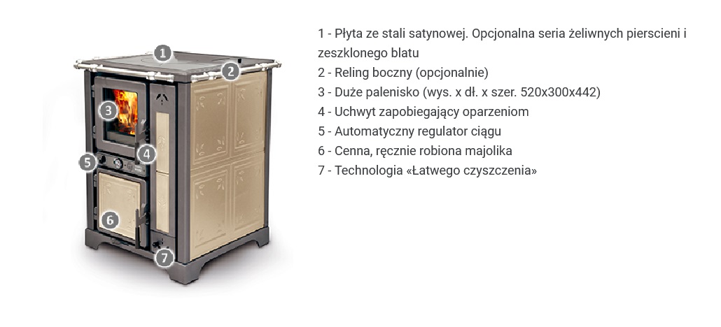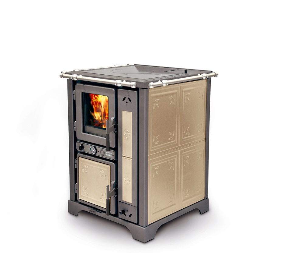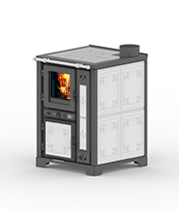 Kuchnia wolnostojąca opalana drewnem z płaszczem wodnym do podłączenia do centralnego ogrzewania wykonana z grubej stali. Drobne powłoki ceramiczne są dostępne z dekoracją kwiatową; drzwi żeliwne z uchwytem zapobiegającym poparzeniu. Szkło ceramiczne do obserwacji płomienia, moc całkowita 20,3 kW, moc nominalna 17,9 kW, 10 kW na wodę i 7,7 kW na otoczenie; palenisko o maksymalnych wymiarach 540x300x442 (wys. x szer. x gł.) powietrze pierwotne, zestaw powietrza wtórnego z automatycznym termostatem. Jego urządzenie optymalizuje zużycie drewna, zapewnia większą autonomię i umożliwia wyższą wydajność. Wymiary drzwi przeciwpożarowych 235×210 mm (wys. x szer.).