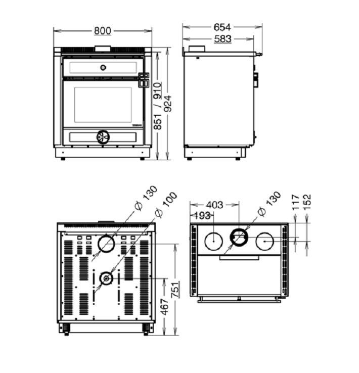 Wylot dymu : Dostępne 4 wyloty dymu Ø130 mm (3 górne – 1 tylny)