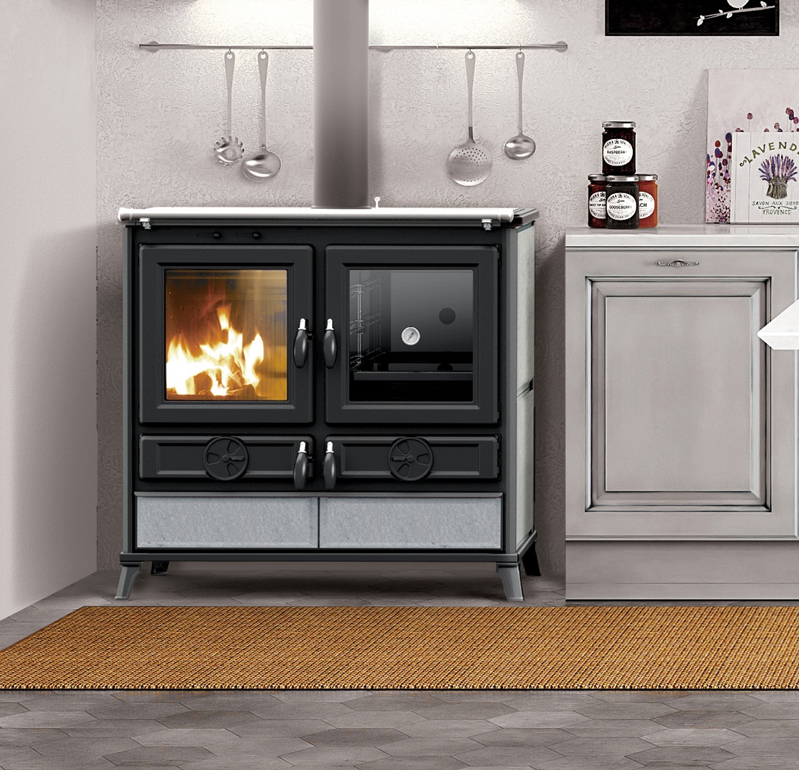 Kuchnia opalana drewnem zbudowana ze stali i żeliwa z dużą powierzchnią wymiany i długimi obowiązkowymi drogami dymu, wyposażona w specjalny wymiennik ze stali nierdzewnej, żeliwną komorę spalania, regulatory do regulacji powietrza pierwotnego, wtórnego i trzeciorzędowego, uchwyty o wyglądzie vintage, otrząsacz rusztu, Starter który ułatwia rozpalanie ognia w piecu, drzwi paleniska z żeliwa emaliowanego ze szkłem ceramicznym odpornym na temperaturę 750°, rama górna z żeliwa emaliowanego, płyta z żeliwa szlifowanego, podwójny szereg pierścieni żeliwnych, Reling przedni, drzwiczki piekarnika z termometrem, piekarnik emaliowany panoramiczny od 43 l, szuflada na drewno i narzędzia, wyjmowana szuflada na popiół, nóżki z żeliwa emaliowanego.