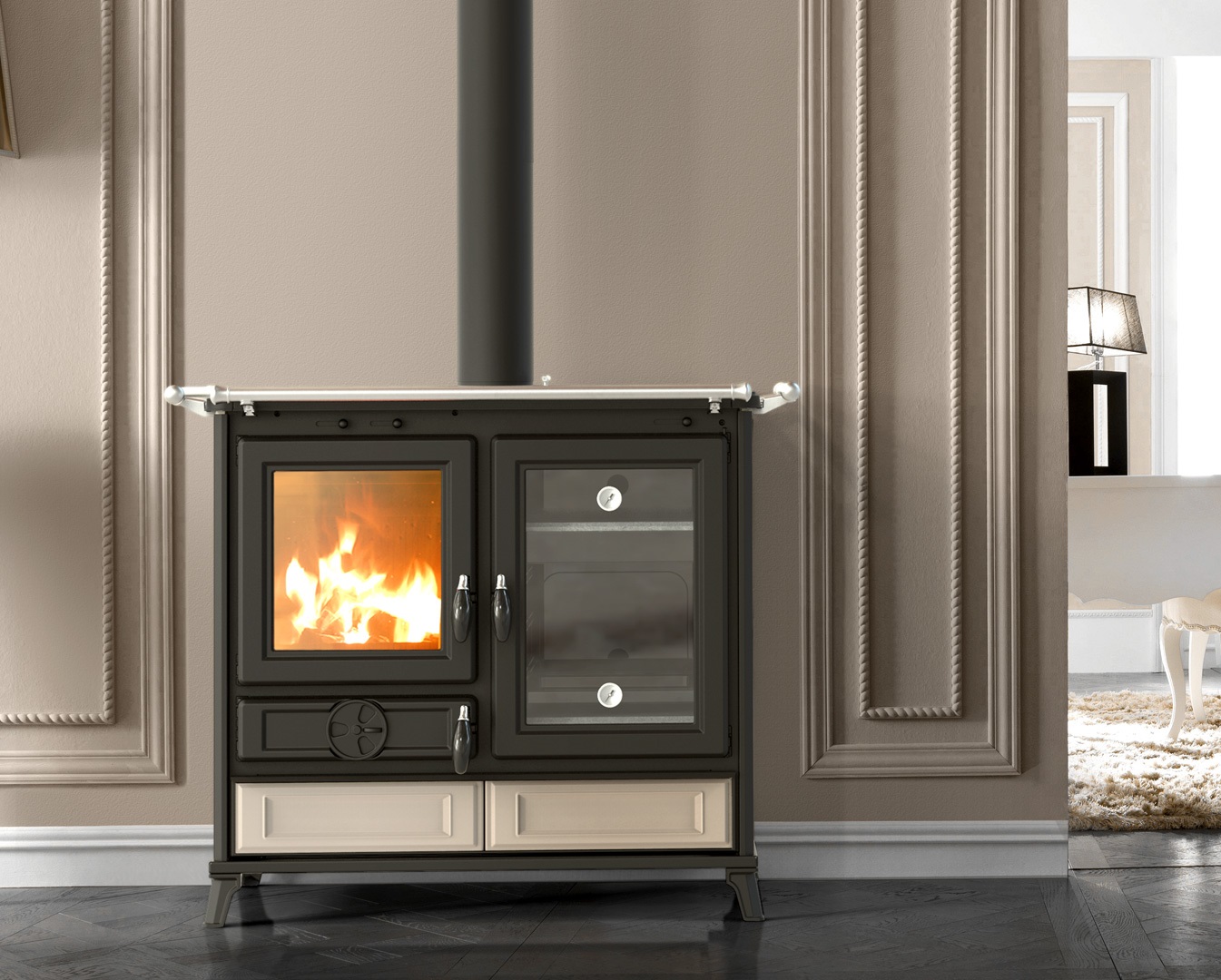 Kuchnia opalana drewnem zbudowana ze stali i żeliwa, wyposażona w specjalny wymiennik ze stali nierdzewnej, żeliwną komorę spalania, regulatory do regulacji powietrza pierwotnego, wtórnego i trzeciorzędowego, uchwyty w stylu vintage z bakelitu, otrząsacz rusztu , Starter ułatwiający rozpalenie ognia w piecu, drzwi paleniska z żeliwa emaliowanego ze szkłem ceramicznym odpornym na temperaturę 750°, rama górna z żeliwa emaliowanego, płyta z żeliwa szlifowanego, podwójny szereg kręgów żeliwnych, reling przedni, opatentowane urządzenie PANEPIZZA do zarządzania temperaturą pieców, regulator temperatury piekarnika, drzwiczki piekarnika z 2 termometrami, emaliowany dolny piekarnik o pojemności 35 l z podstawą z podstawą ze steatytu, emaliowany górny piekarnik o pojemności 14 l z podstawą ze steatytu, szuflada na narzędzia lub drewno, wyjmowana szuflada na popiół, nóżki z emaliowanego żeliwa. Okładzina zewnętrzna z majoliki i żeliwa.