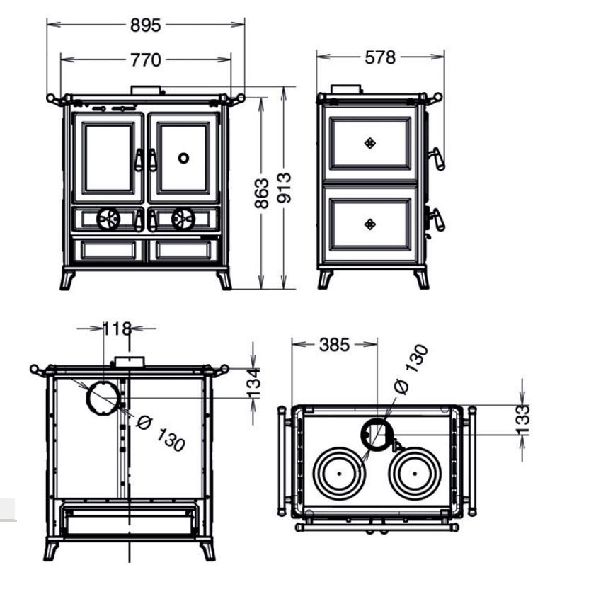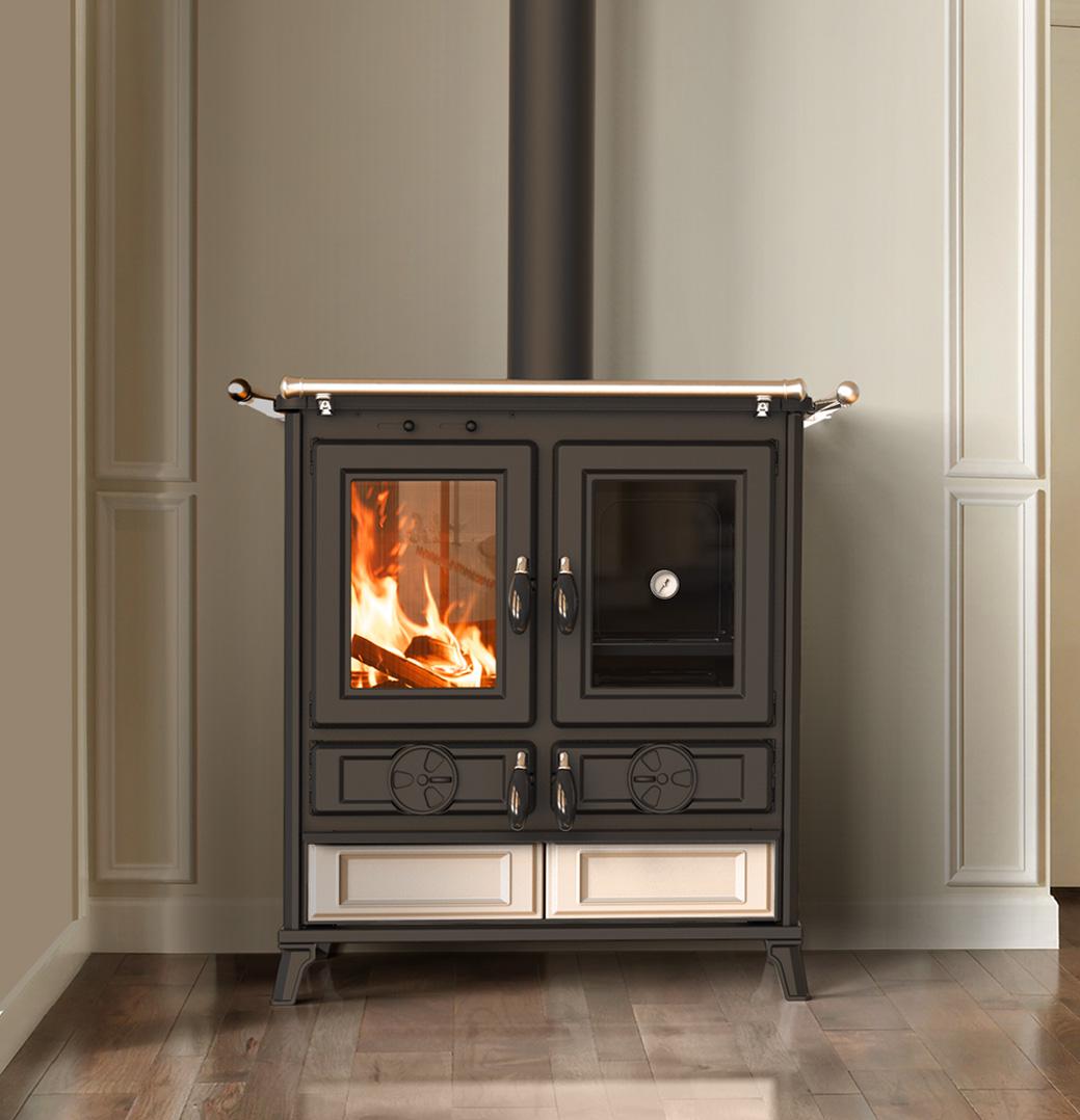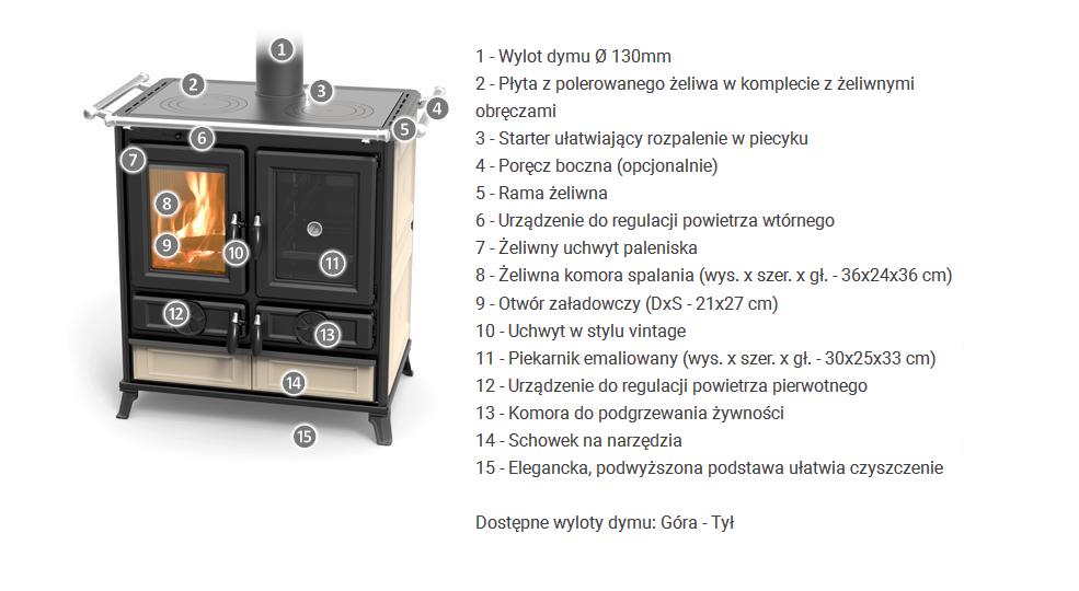 Kuchnia opalana drewnem zbudowana ze stali i żeliwa z dużą powierzchnią wymiany i wyposażona w specjalny wymiennik ze stali nierdzewnej, żeliwną komorę spalania, regulatory do regulacji powietrza pierwotnego, wtórnego i trzeciorzędowego, uchwyty o wyglądzie vintage, otrząsacz rusztu, Starter ułatwiający rozpalenie w piecyku, drzwi paleniska z żeliwa emaliowanego ze szkłem ceramicznym odpornym na temperaturę 750°, rama górna z żeliwa emaliowanego, płyty kuchenne z żeliwa szlifowanego, podwójny szereg pierścieni żeliwnych, reling przedni, drzwiczki piekarnika z termometrem, piekarnik emaliowany panoramiczny od 27 l, szuflada na drewno i narzędzia, wyjmowana szuflada na popiół, nóżki z żeliwa emaliowanego. Okładzina zewnętrzna z majoliki i żeliwa.