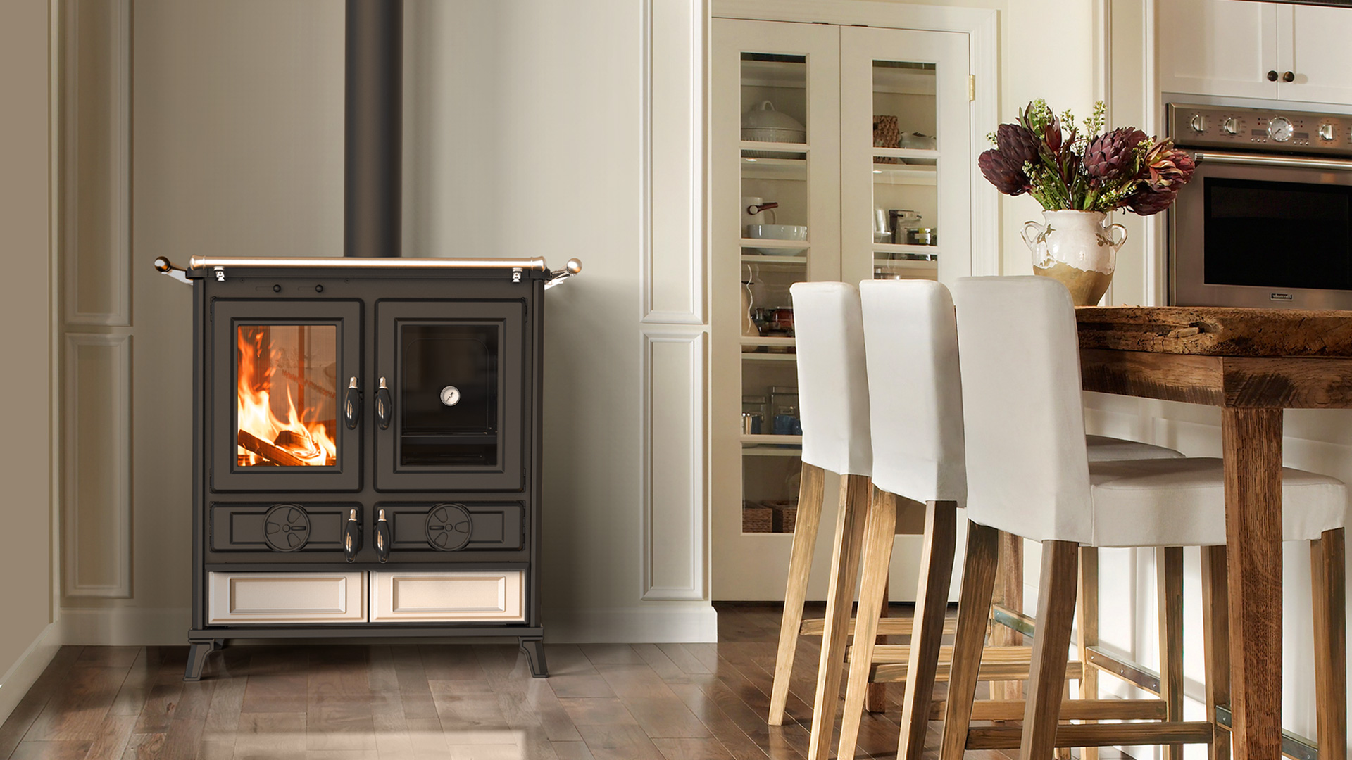 Kuchnia na drewno Violetta to urządzenie z nowej linii produktów włoskiej marki Thermorossi. Ze względu na swój niepowtarzalny design oraz funkcjonalność jest znakomitym dodatkiem do wnętrz zarówno nowoczesnych jak i klasycznych.