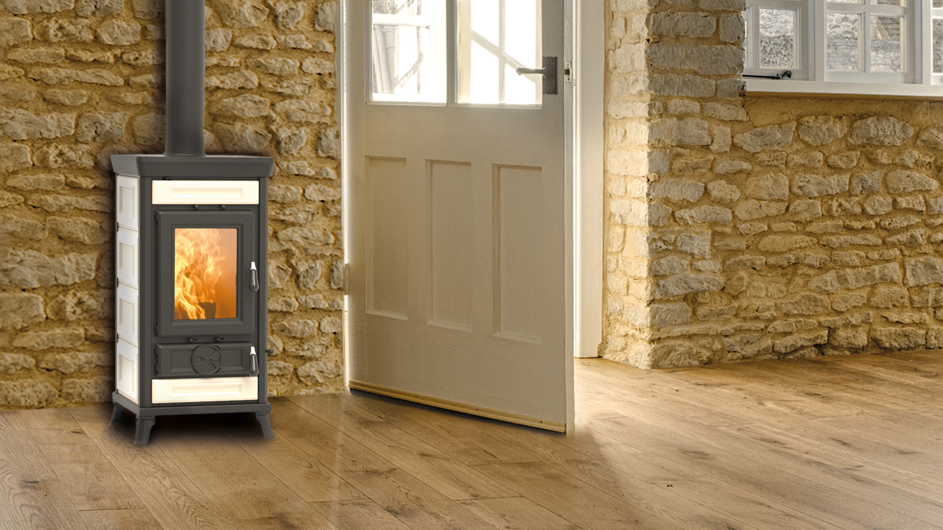 Emaliowane żeliwne drzwiczki z szybą ceramiczną odporną na temperaturę 750°C. Umożliwiają bezpieczny widok ognia.