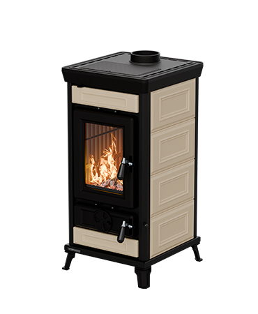 Piec opalany drewnem Thermorossi Sofia Evo5, o klasycznym wzornictwie, łączy elegancję i funkcjonalność.