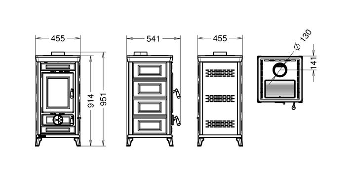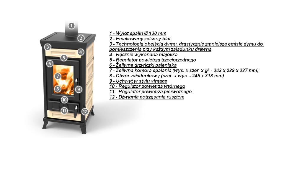 Wierzchnia część pieca wykonana jest z emaliowanego żeliwa.