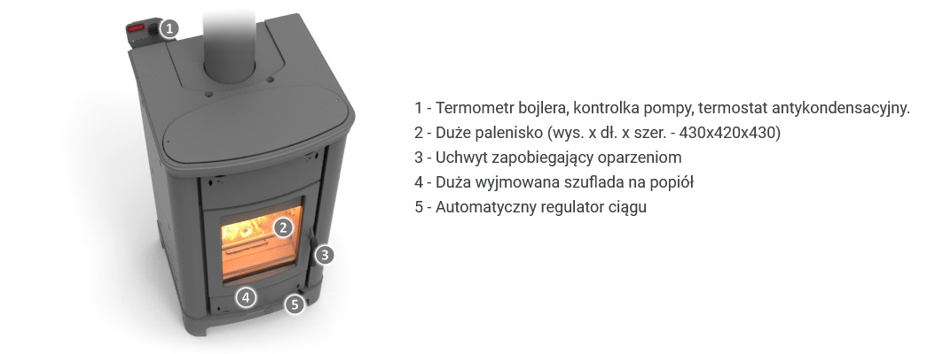 Piecyk posiada duże żeliwne drzwi paleniska z szerokim widokiem na płomień.