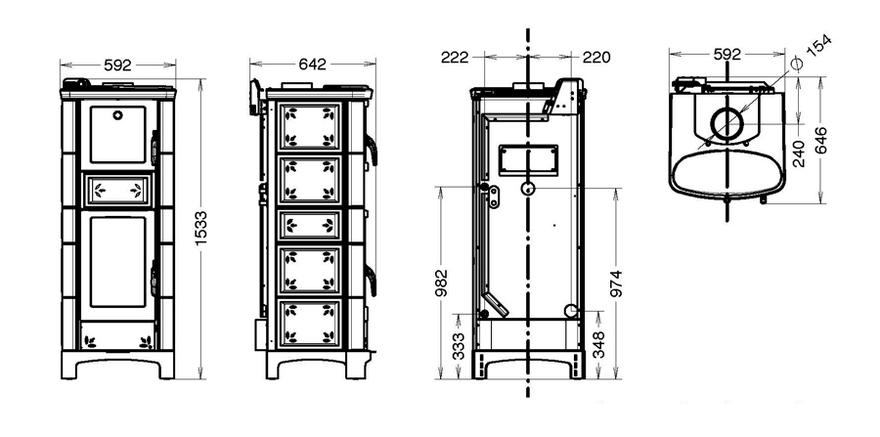 Piekarnik wysokotemperaturowy: ze stali emaliowanej, otoczony ze wszystkich stron ciepłem spalin i regulowanym zaworem do uwalniania oparów kuchennych