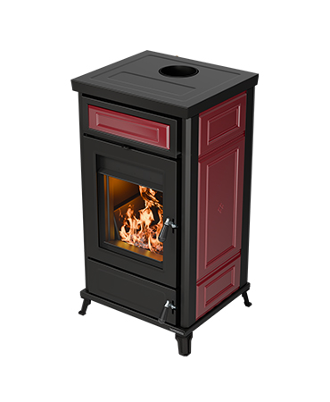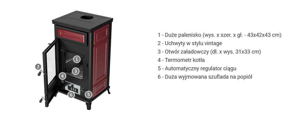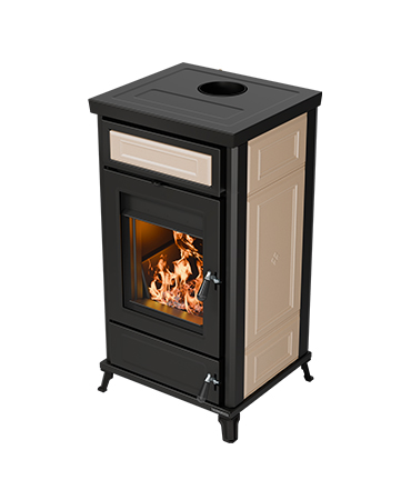 Piecyk Dora Maiolica idealnie nadaje się do ogrzewania powierzchni o powierzchni do 207 m². Posiada duże palenisko, uchwyty w stylu vintage, termometr bojlera, automatyczny regulator ciągu i wyjmowaną szufladę na popiół