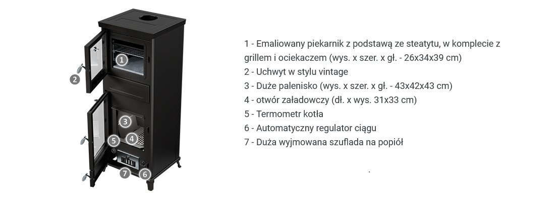 Duży piekarnik ze stali: wyposażony jest w przestronny piekarnik z ociekaczem i rusztem, który można ustawić na trzech poziomach. Podstawa piekarnika wykonana jest ze steatytu, co umożliwia bezpośrednie gotowanie.