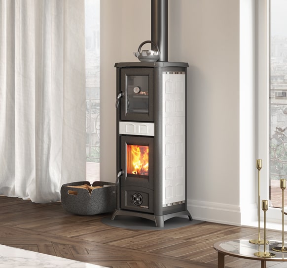 Piecyk wolnostojący na drewno z piekarnikiem, powietrzny. Palenisko, górna płyta i drzwiczki żeliwne, wysuwany popielnik. Obudowa wykonana z kafli Majolica: elegance – kolor bordowy lub białym oraz w naturalnym kamieniu – steatyt. Powietrze do spalania: pierwotne + dopalanie spalin + system ‚czysta szyba’. Podłączenie wylotu spalin z góry.