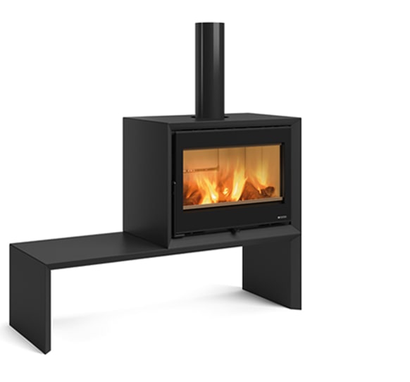 Piec wolnostojący w zestawie zawiera ławę w formie podstawy: