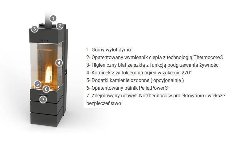 Piec jest wyposażony w palnik z napędem silnikowym z opatentowaną technologią PelletPower®. System ten pozwala na utrzymanie wysokiej i stałej mocy cieplnej, co zmniejsza koszty eksploatacji związane ze zużyciem i konserwacją.