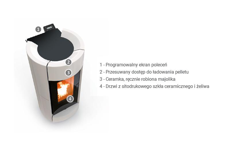 Piec ma moc znamionową 12,1 kW, co czyni go odpowiednim do ogrzewania średniej wielkości pomieszczeń.Panele są wykonane z doskonałej, ręcznie robionej ceramiki. System dostępu do zbiornika przez czarną kryształową pokrywę upraszcza uzupełnianie peletu.