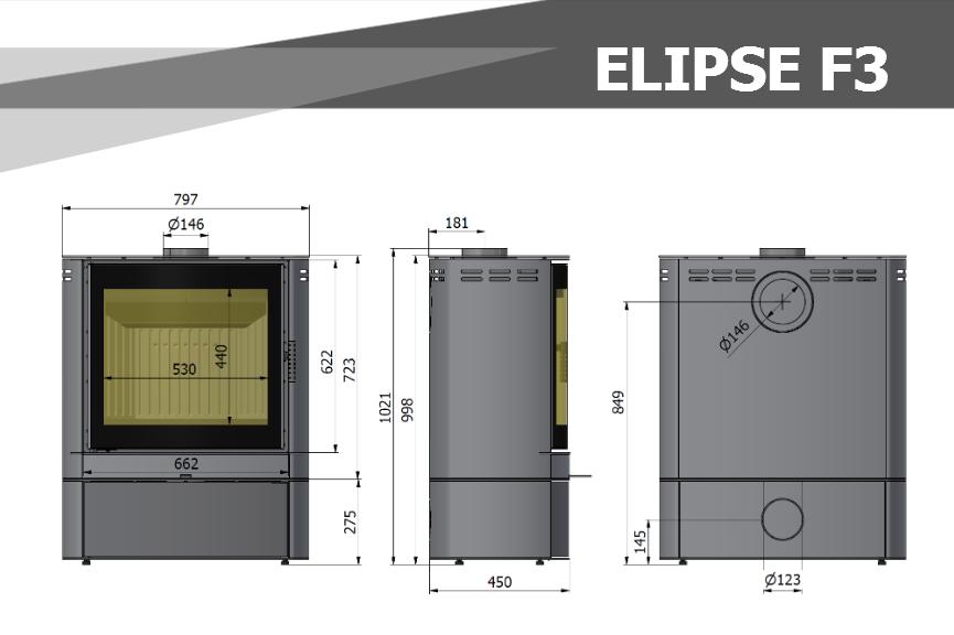 Piec kominkowy ELIPSE posiada zamkniętą komorę paleniskową wyłożoną ceramiką akumulacyjną z wyjmowanym rusztem żeliwnym i popielnikiem. Króciec dolotu powietrza zapewnia stały dostęp powietrza do spalenia, wobec tego umożliwia montaż piecyka w domach z wentylacją mechaniczną, czy rekuperacją. System wielokierunkowego napowietrzania opału oraz konstrukcja trójdeflekcji spalin zapewnia perfekcyjne spalanie i ekonomię na najwyższym poziomie. Ergonomiczny regulator pozwala pięciostopniowo sterować mocą urządzenia, a wentylowany uchwyt klamki z zamkiem typu „Click” zwiększa komfort użytkowania. Wszystkie modele ELIPSE oferują możliwość instalacji wylotu spalin w dwóch płaszczyznach – pionowo do góry lub poziomo na plecach piecyka.