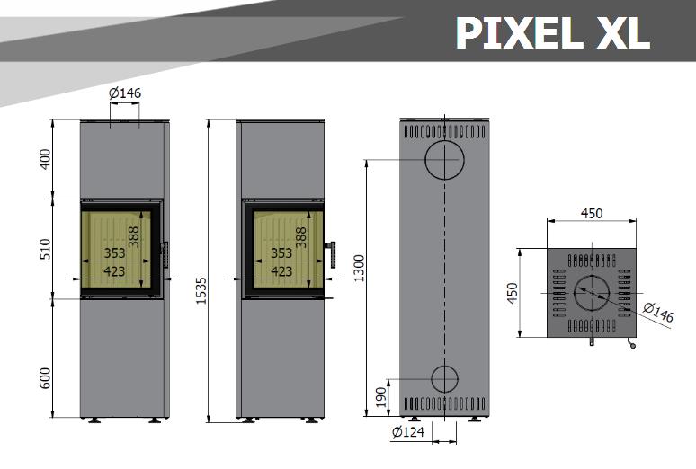 Piec kominkowy PIXEL posiada zamkniętą komorę paleniskową wyłożoną ceramiką akumulacyjną z wyjmowanym rusztem żeliwnym i popielnikiem. Króciec dolotu powietrza zapewnia stały dostęp powietrza do spalenia, wobec tego umożliwia montaż piecyka w domach z wentylacją mechaniczną, czy rekuperacją. System wielokierunkowego napowietrzania opału oraz konstrukcja trójdeflekcji spalin zapewnia perfekcyjne spalanie i ekonomię na najwyższym poziomie. Ergonomiczny regulator pozwala płynnie sterować mocą urządzenia, a wentylowany uchwyt klamki zwiększa komfort użytkowania. Wszystkie modele PIXEL oferują możliwość instalacji wylotu spalin w dwóch płaszczyznach – pionowo do góry lub poziomo na plecach piecyka.