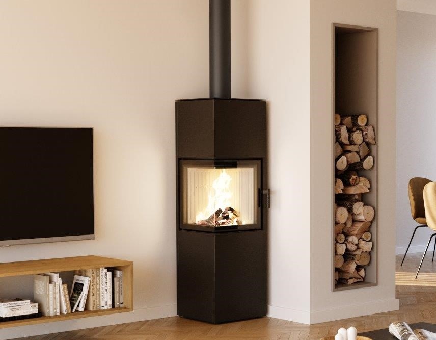 Wolnostojący piec na drewno PIXEL o prostokątnej formie z dwustronną wizją ognia jest idealną propozycją dla osób, które chcą praktycznie wykorzystać przestrzeń w swoim domu.