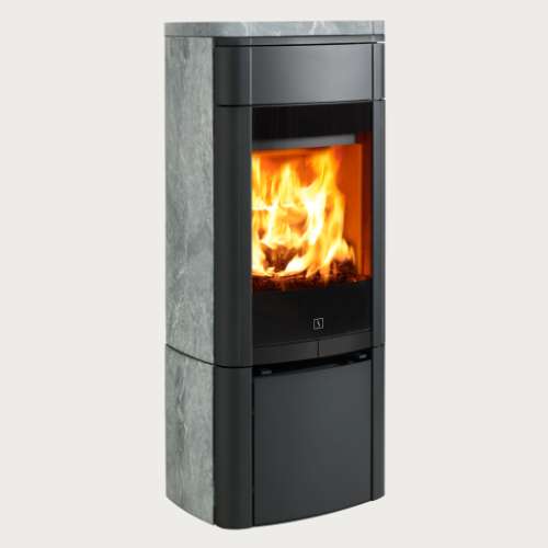 Jest to średniej wielkości piec z dużymi szklanymi drzwiami zapewniającymi doskonały widok płomieni. Okładziny z naturalnego kamienia integrują się z piecem zachowując jego czystą ekspresję.